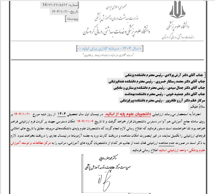 ارزشیابی دانشجویان علوم پایه از اساتید در نیمسال اول سال تحصیلی ۱۴۰۴ از روز شنبه مورخ ۲۰/۱۰/۱۴۰۴ بر روی سامانه جامع آموزشی هم آوا در دسترس دانشجویان قرار خواهد گرفت.
